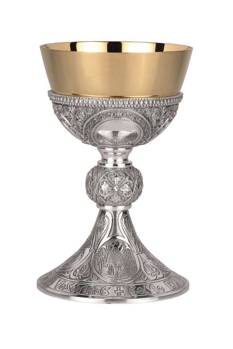 Unit price perAttractive design of Romanesque influence and the symbols of the Four Evangelists on the base. Spanish text on the base reading “Como el Señor me amó, asi os amo yo a vosotros” which translates in English to: “Like the Lord Loved me, I love you”. The striking silver base and node give way to a simple gold plated cup, creating an elegant two-tone effect. Includes a 6 1/4" dish paten.