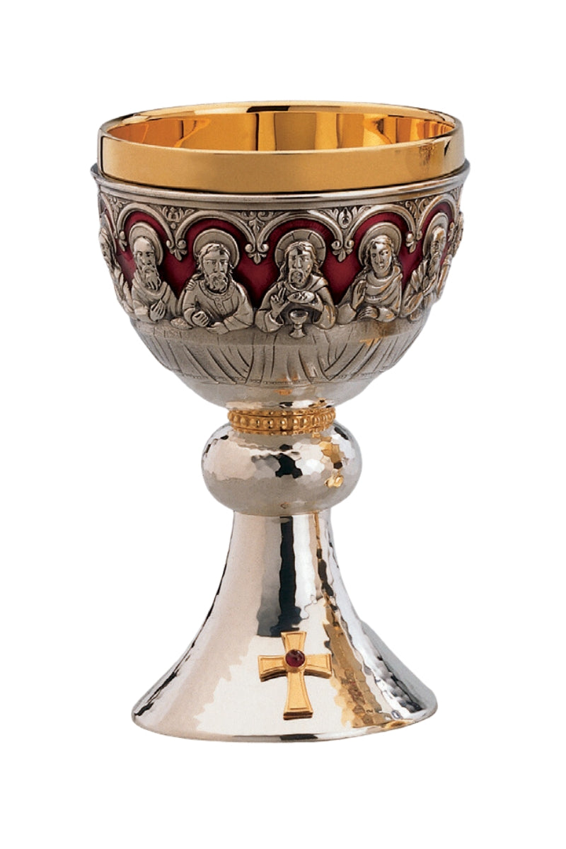 Unit price perThis elegant chalice inspired by the Romanesque style features the Last Supper with the 12 apostles sculpted around the cup with a bold red enameled background. The node and base are finished with a hand hammered effect. The golden inner cup, rim, node accent, and cross on the base add a subtle two-tone to the piece. The cross on the base is set with a red gemstone to match the enamel of the cup. Includes a matching 6" bowl paten (not pictured).