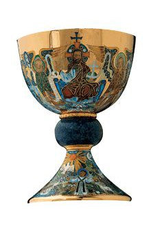 Unit price perFire enameled version of the eighth century Tassilo chalice, executed in cloisonne fire enamel, solid 925 sterling silver, 24 K gold lined cup. Represents the Pantocrator and the Four Evangelists as well as an inscription in Latin on the base "Per Ipsum, Cum Ipso, In Ipso" (For Him, With Him, In Him). Includes 6 1/2" paten.