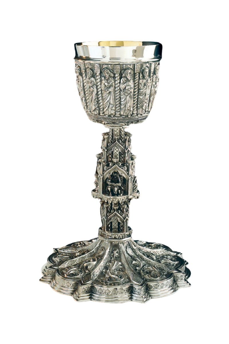 Unit price per"The Gothic" chalice is a replica of the exquisite piece commissioned by the Vatican as a present for John Paul II on his fiftieth anniversary of the priesthood. The sterling silver, gold lined chalice features exquisite deep relief work depicting the Four Evangelists embedded into node chapels, Christ and the Twelve Apostles on the cup, and a deeply sculptured "Flower of Passion" motif on the base. Includes a 6 1/2" scale paten with ring. The chalice and paten are made in 925 sterling silver.