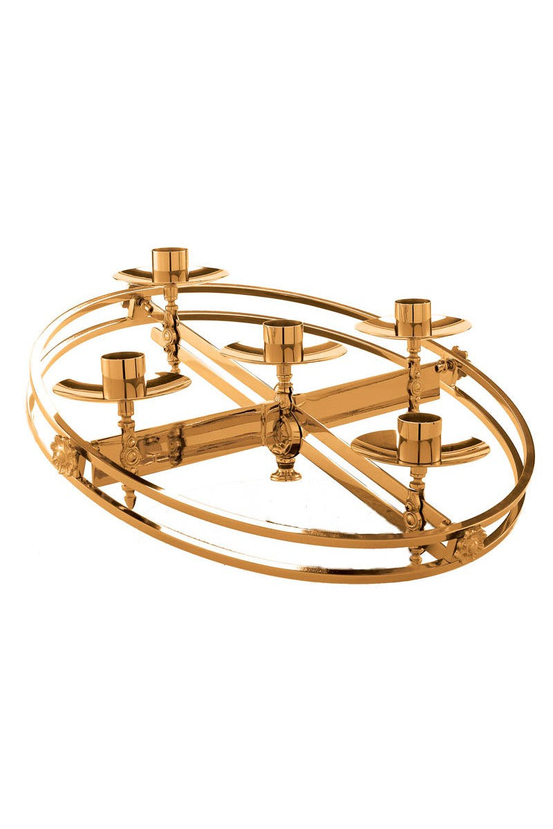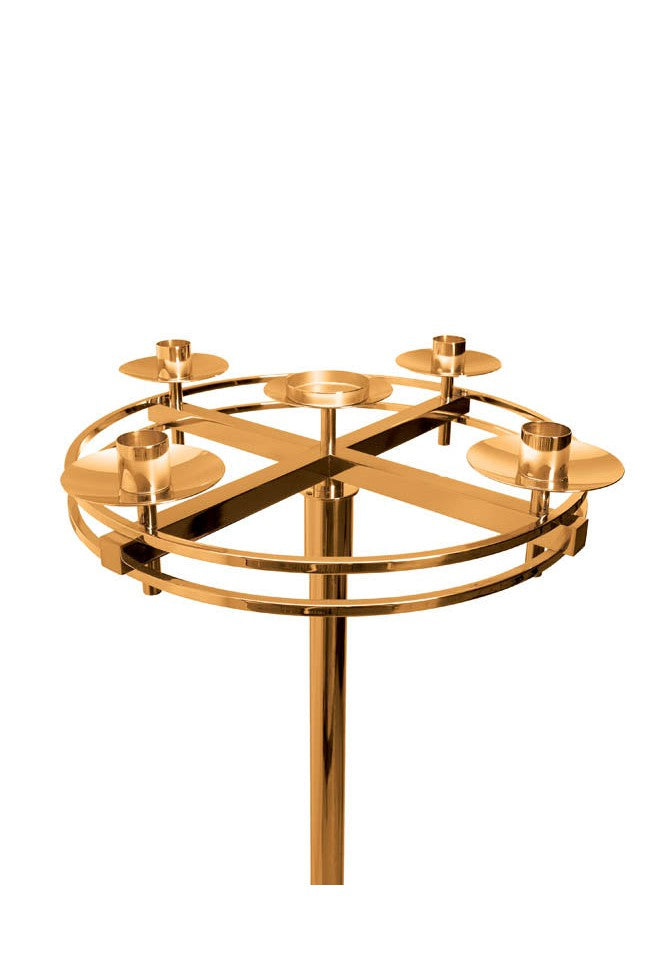 Unit price per26" dia. rings (durable gold powder coated), combination polished/satin bronze finish, all 3" sockets standard, 36 1/2" ht. to paschal bobeche, 41" ht. to Christ Candle bobeche. Candles not included. Please specify paschal socket size, 1 15/16" will be used unless a different size is specified. For paschal sockets over 3" add $55.