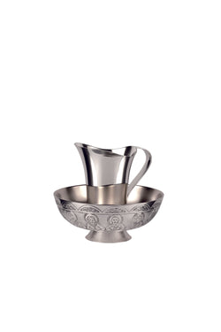 Unit price perJug and basin featuring Last Supper design with Celtic filigree work. Jug is 4 1/2" high x 3 1/4". Bowl is 2 1/2" high x 6 1/4". Available in brass gold plated and brass silver plated.