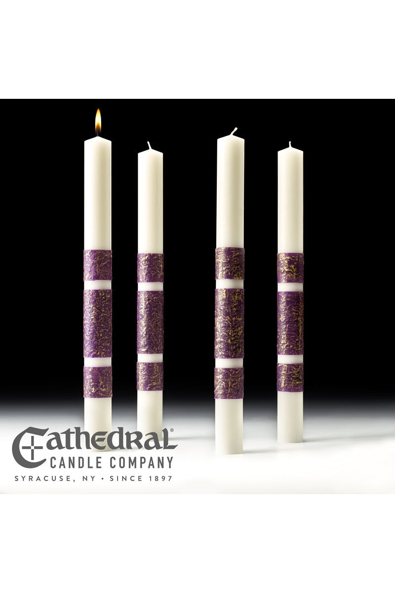 Our 51% Beeswax ArtisanWax Advent Candles feature hand applied purple textured bands made by our devoted artists. Simple and elegant for your Advent display. Our large variety of sizes will accommodate your church needs.