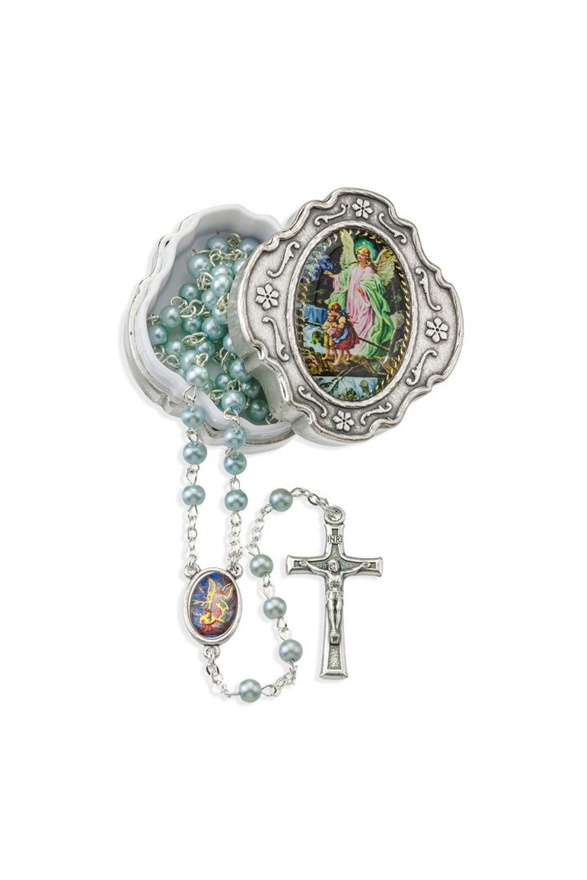 Unit price per4mm White Glass Bead Guardian Angel Rosary in a Metal Box