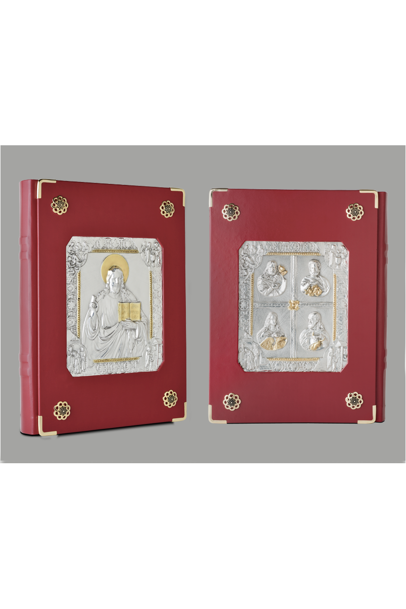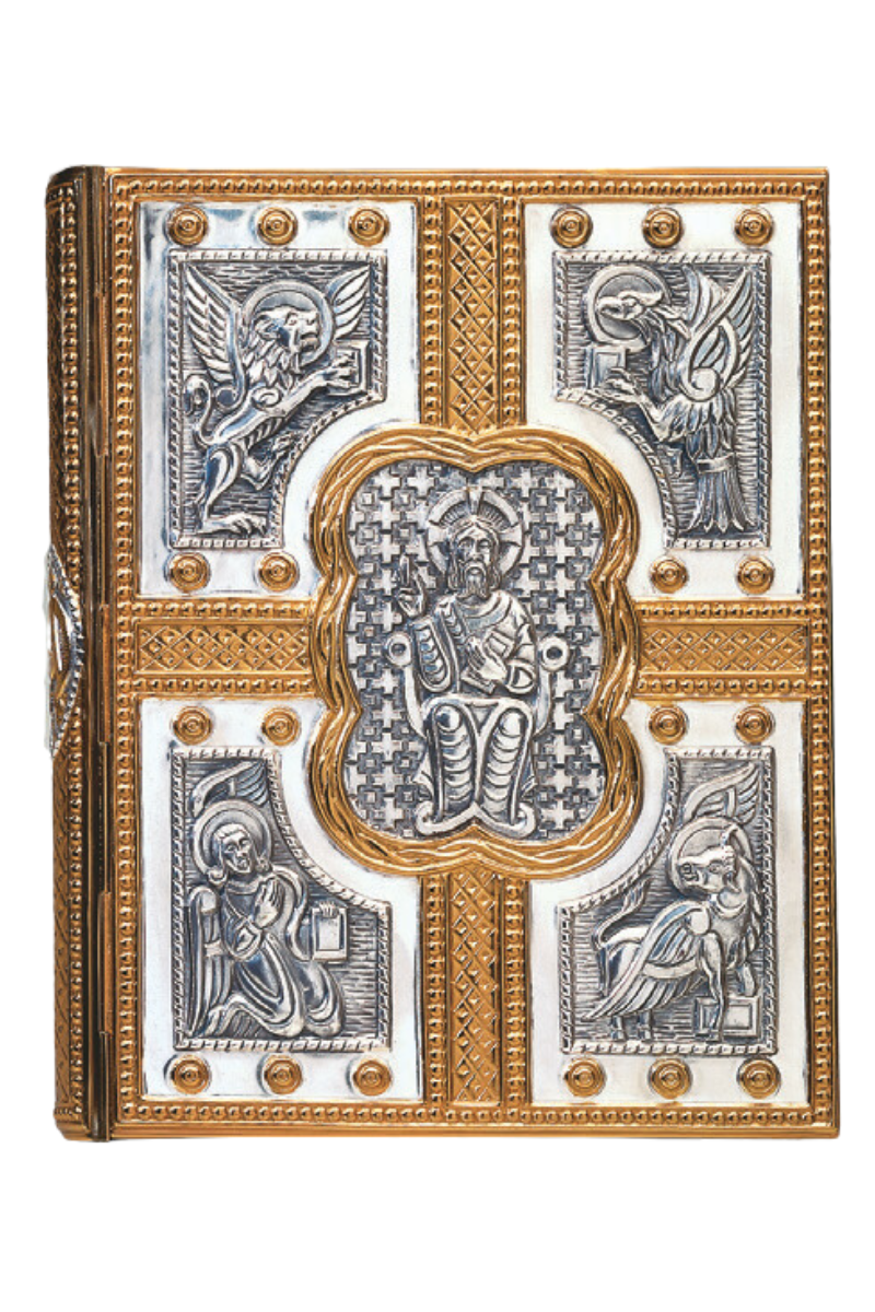 Using traditional Roman design, our Book of the Gospels emphasizes the glory of the word through the use of beautiful gold- and silver-stamped liturgical art.