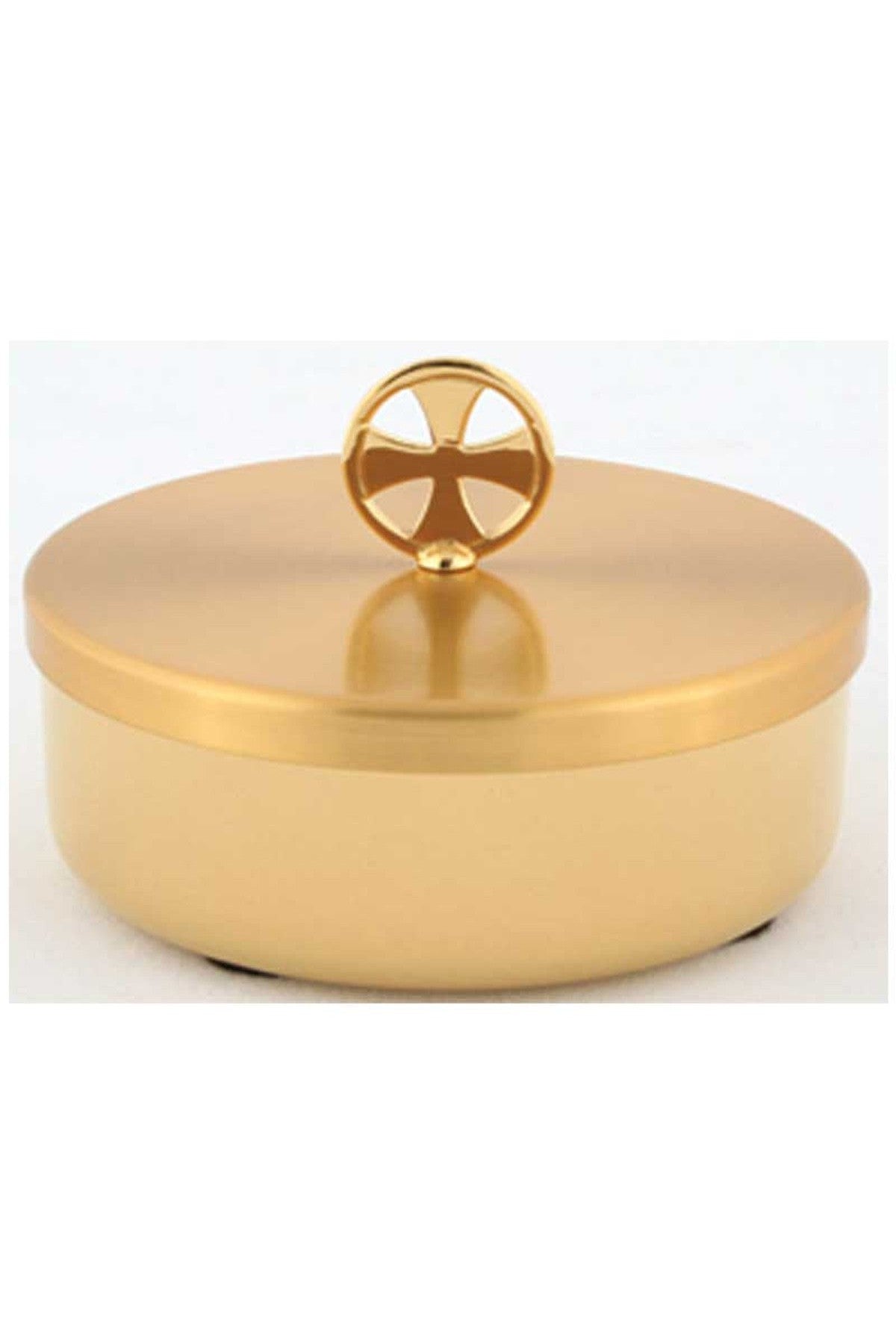 Unit price perThis classic host box is designed to match chalice EW5560. The box is brass with heavy silver plate and a gold lined inside. The lid has a simple engraved cross.