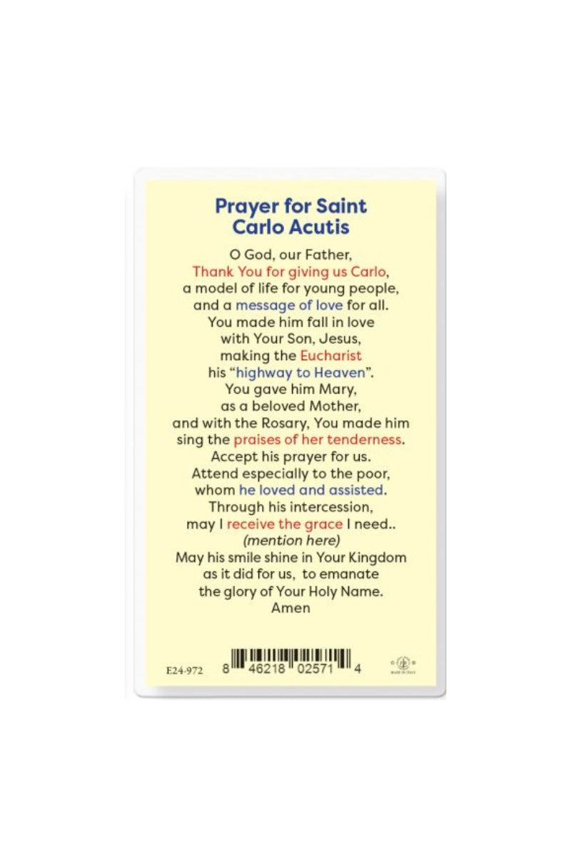 Unit price perDurable and everlasting laminated holy prayer card that contains a color image of Carlo Acutis with the Divine Mercy and Our Lady of Fatima, and A prayer for Carlo Acutis on the back. Card measures 2 1/2" x 4 1/2".