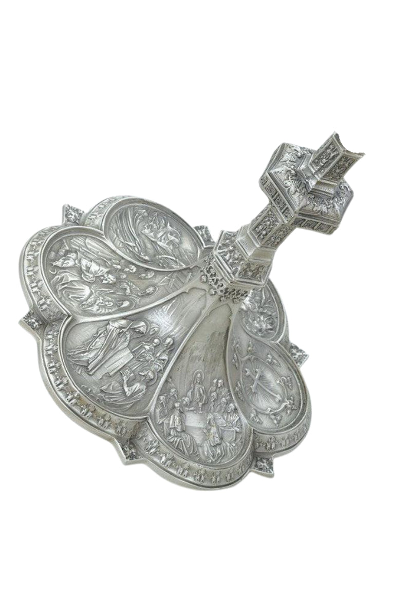 Unit price perThe Byzantine chalice features symbols of the Four Evangelists on the cup collar, surrounded by intricate floral designs that continue down across the node and into the hand-hammered, fluted base. Includes a dish paten adorned with a simple Celtic cross design.