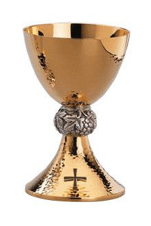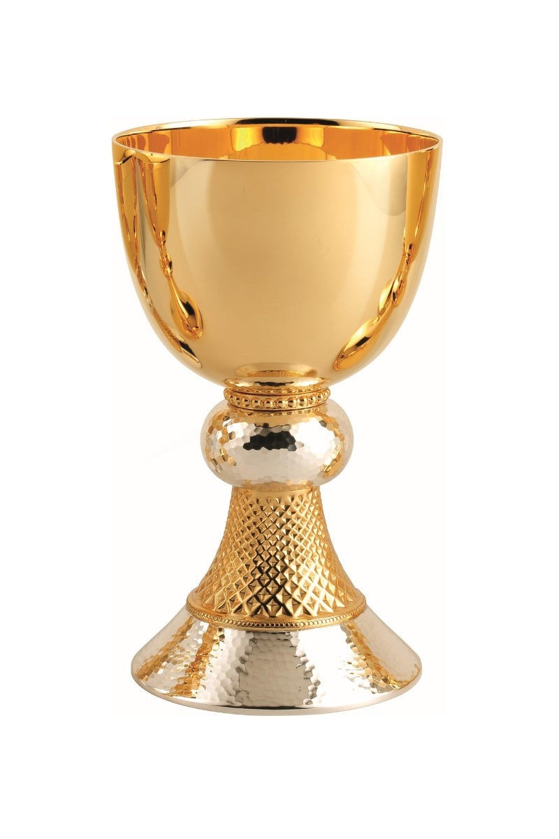 Unit price perThis fully handmade chalice is finished in elegant two tone, with a silver plated node and lower base set against the gold plating of the cup and upper base. The silver node and base feature a lightly hammered texture, while the gold base is ornamented with a chiseled diamond design. Includes a 6 1/4" dish paten (not pictured).