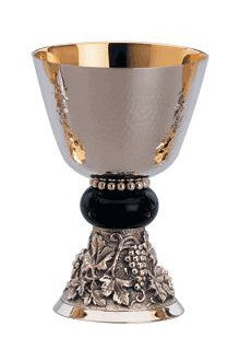 Unit price perThis classic chalice features an elegant, symmetrical base leading up to an intricate node carved with a grapes and leaves motif. The node, finished in silver, creates a beautiful two tone with the gold plating of the rest of the chalice. Includes a 6 1/4" dish paten (not pictured).