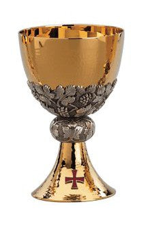 Unit price perThis classically designed brass two tone chalice features an artistic grapes and leaves design engraved on the node and bottom of cup. A red fire enamelled cross is applied to the base. Includes a 6 1/2" bowl paten (not pictured).