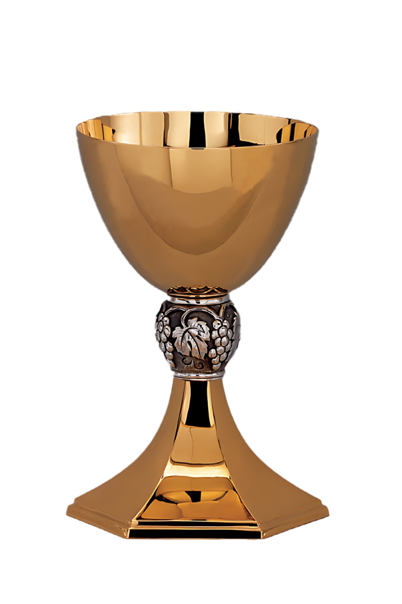 Unit price perThis chalice features a classy design blending together a beautiful cut-out node and a delicate grape and vine outer cup. The three raised panels on the base depict the Sacred Heart, the Blessed Mother, and St. Joseph and are meticulously finished in two-tone (gold and silver). Includes a 6 1/4" scale paten with ring.