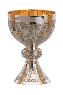 Unit price perThe Romanesque chalice has been developed by silversmiths to reflect the beauty and character of the classic style, blending elegance, balance, and craftsmanship in one. Deep relief work around the cup features Christ and the 12 Apostles at the last supper. The base is adorned with a large cross design, and the node is accented with a simple engraved pattern. The rim and inside of the cup are pictured with gold lining, creating a striking two-tone effect. Includes a 6 1/4" scale paten with ring (not pictured).