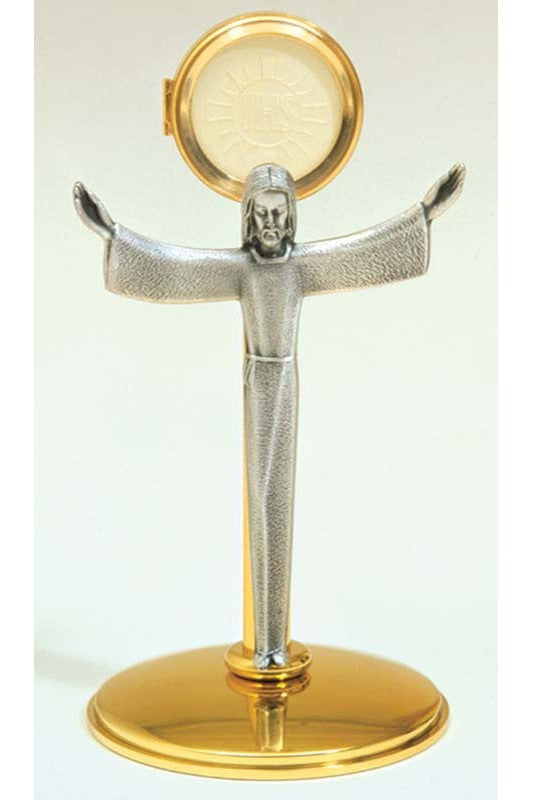 Unit price perGold plated with oxidized Risen Christ figure. Secure acrylic glass luna 2 3/4". 11" H., 6" W., 5 1/2" base.
