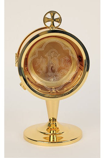 Unit price perChapel monstrance/luna holder made of brass and gold plated. Height is 10", width 4-1/2", base 4" diameter. The track is adjustable and allows most lunas to fit. Hinged back door for easy access. This extra large luna holder works as a chapel monstrance.