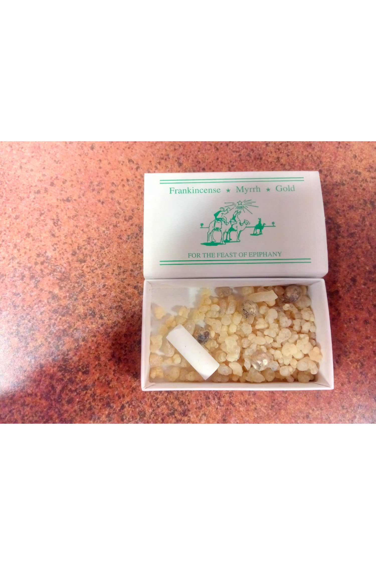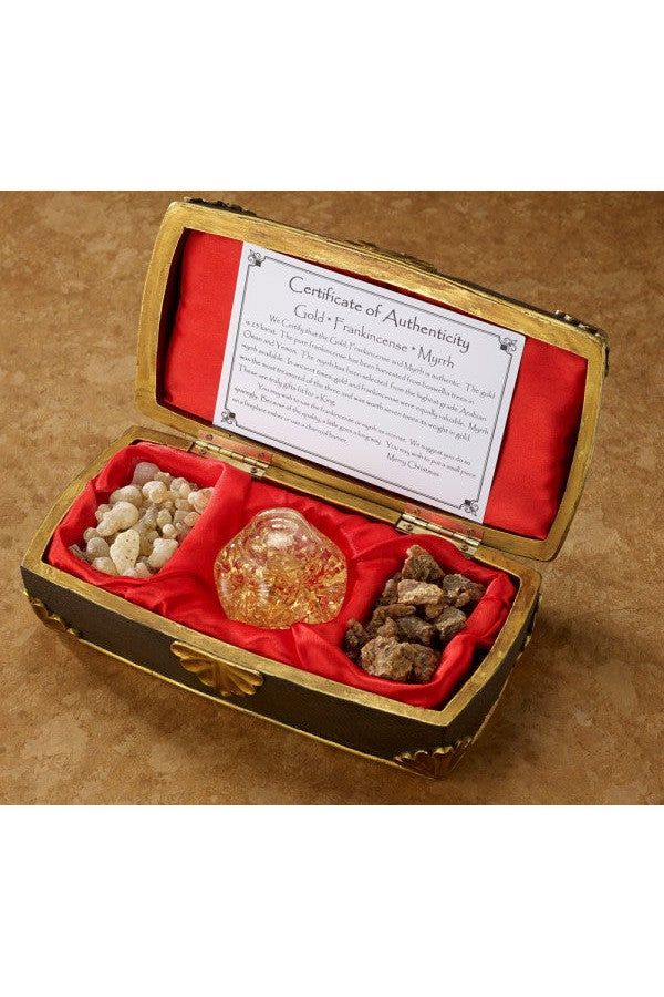 INCLUDED WITH EACH SET: A gold embossed display card that tells the story of the Three Kings and a Certificate of Authenticity stating that the gold is real and the Frankincense & Myrrh are from the same regions as the original gifts.