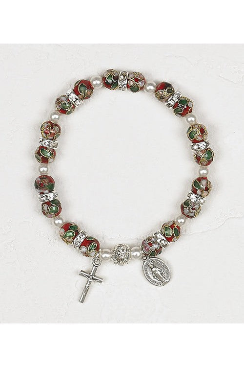 Unit price per| Tasteful stretch bracelet made of red cloisonne beads spaced with stress crystals and imitation pearls. A single silver tone Nativity charm hangs from the bracelet. Gift boxed. |