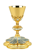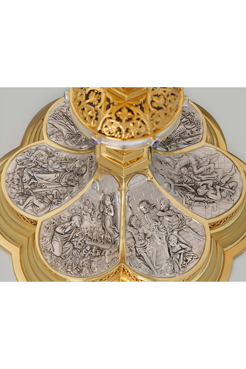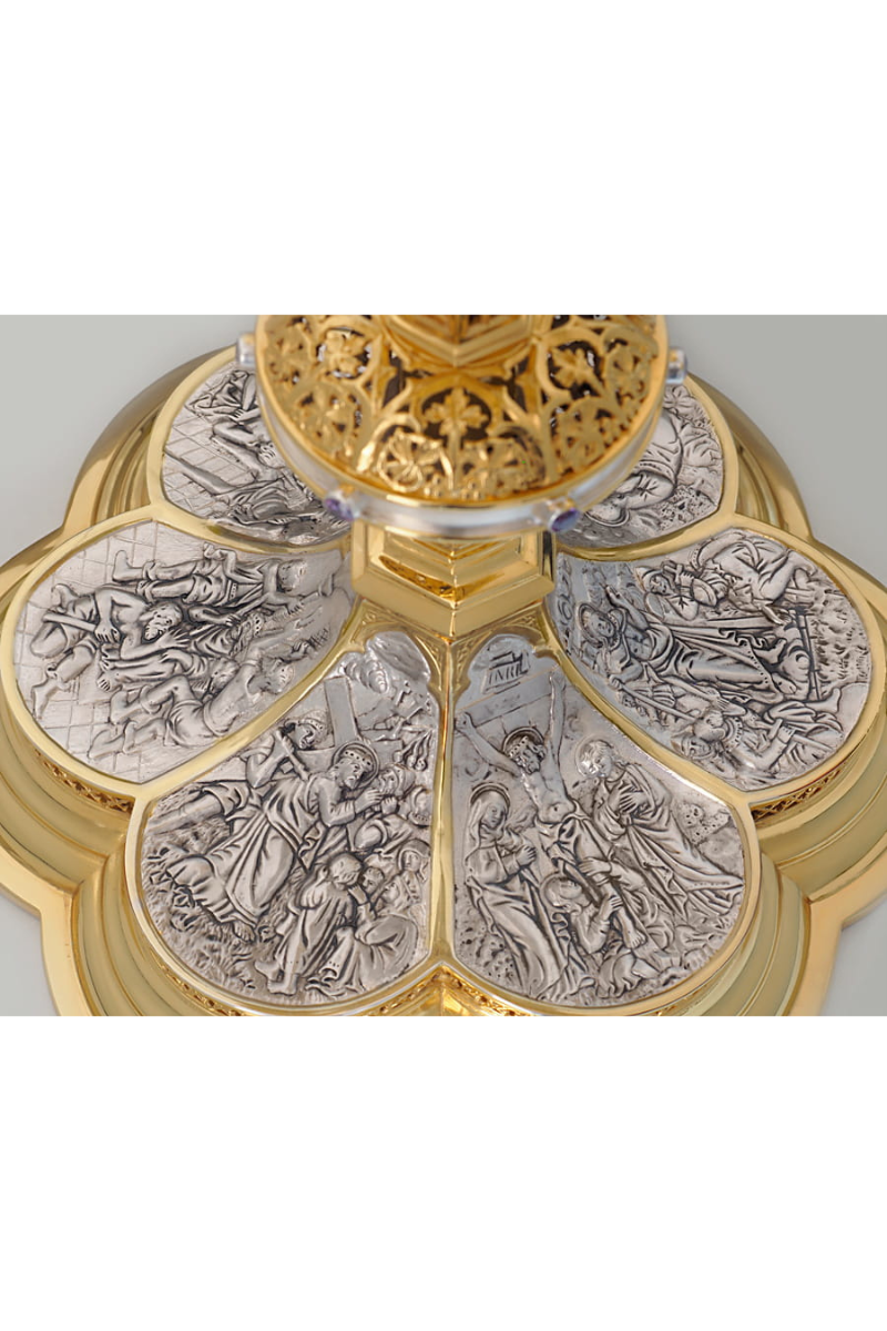 Chalice made of brass, gold-plated. Decorated with silver-plated and oxidized scenes from the New Testament sculpted on the base. The featured scenes depict the Passion of Jesus and the Resurrection.