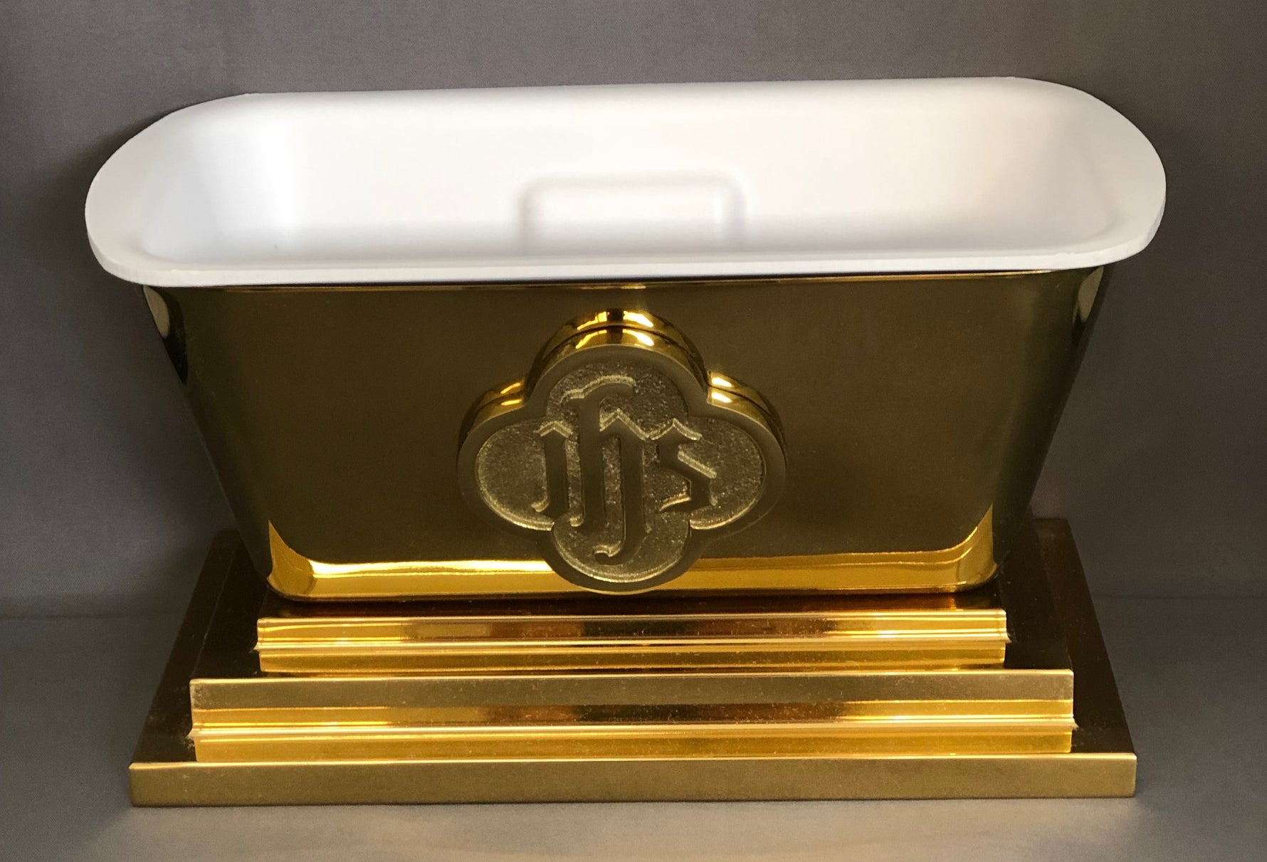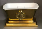 Unit price perVase liner for the Sudbury vase # 153. Made of white polystyrene plastic with a flat flange to rest on the top of the brass vase to eliminate spills. This is an exact replica of the traditional green plastic vase liner that is no longer available. Height 3 1/4”, Length 8 7/8” with flange. Sold by each.