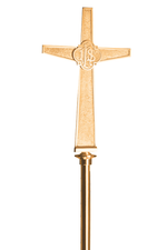 Unit price perThis Processional Cross features a contemporary cross with IHS inscription.. Available in brass or bronze, it is oven-baked for durability and can be finished in either satin or high polish. The Crucifix measure eighty-seven inches tall and the square base measures ten inches. The staff will be outfitted with a vinyl sleeve to protect against tarnish.
