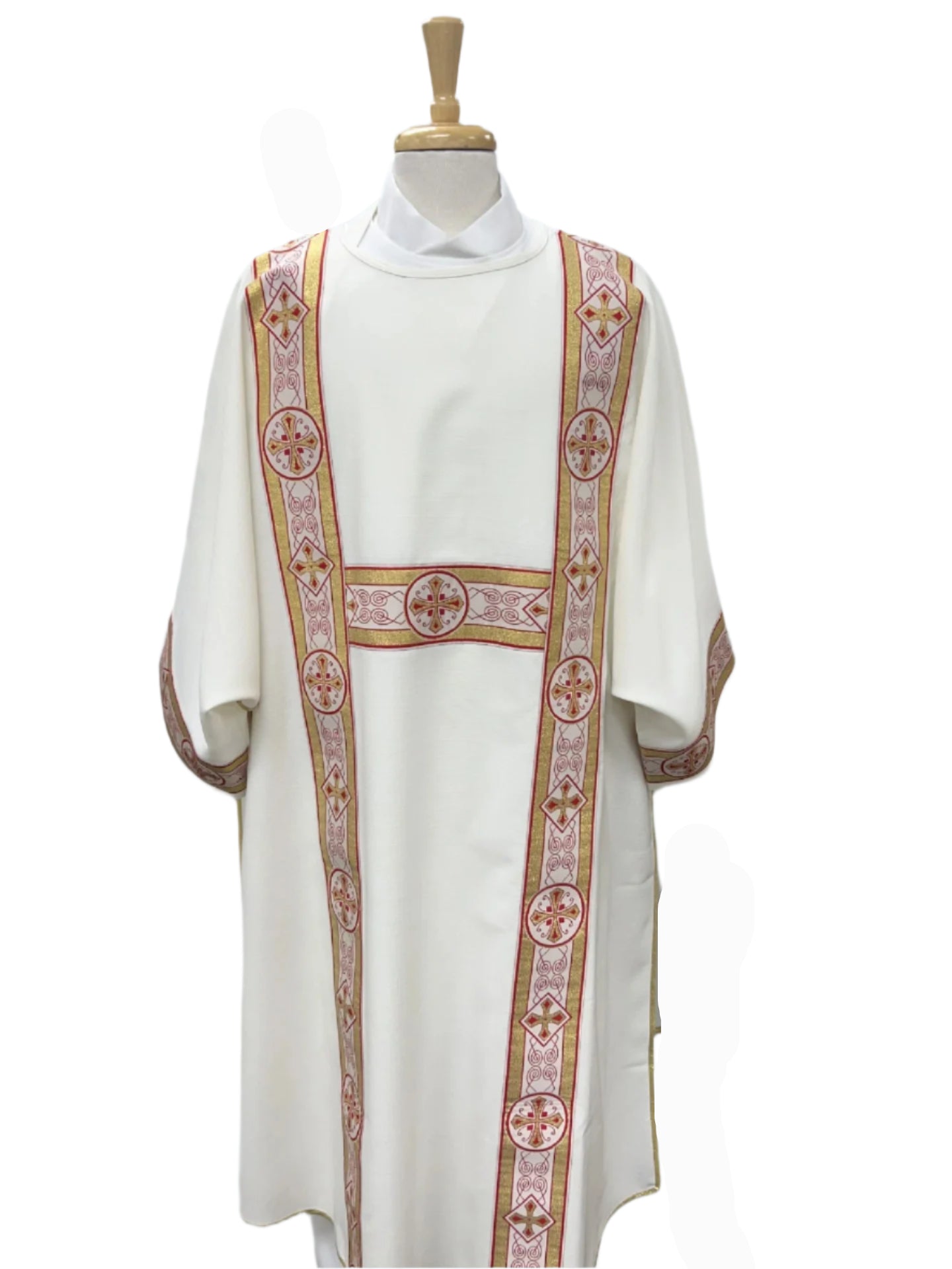 White dalmatic with cross designs running down the center.