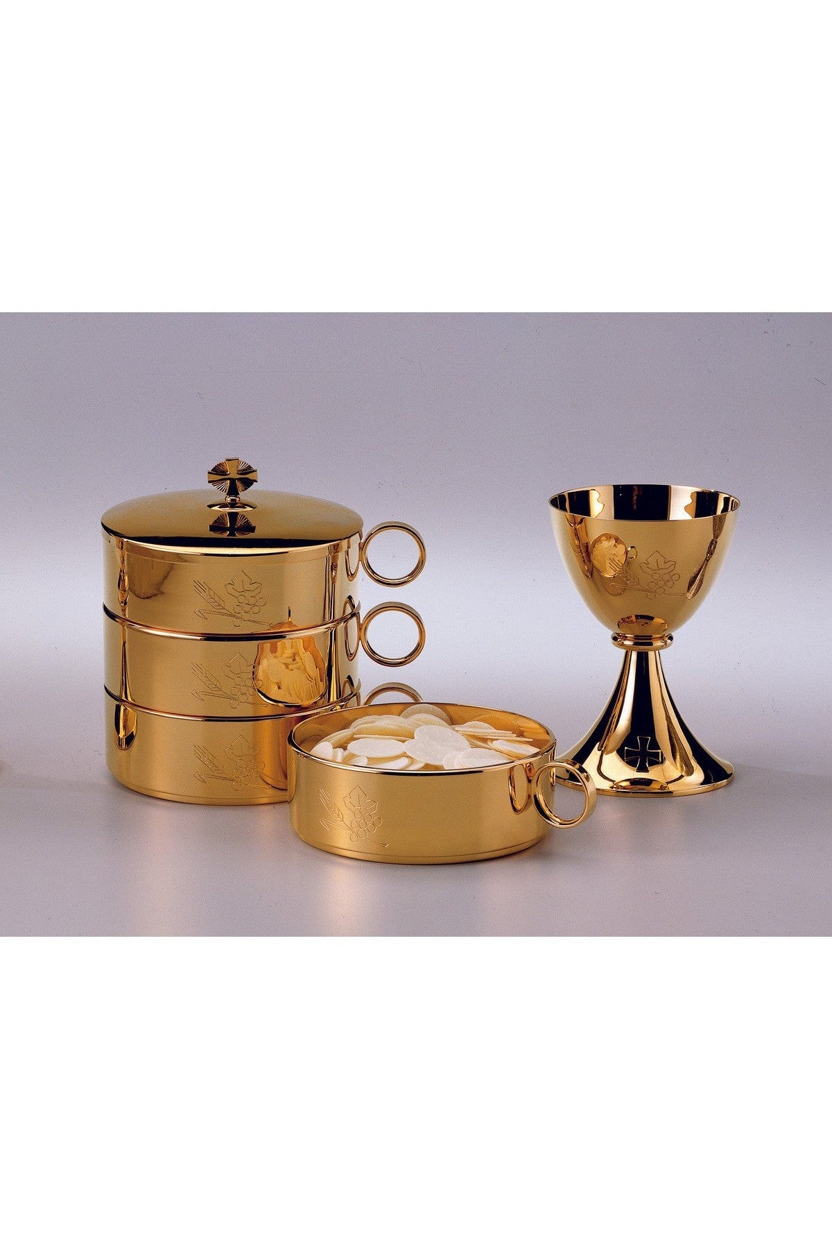 Unit price perThis elegant chalice is entirely gold plated featuring hand-engraved wheat and grape motifs on the cup to match stacking ciboria EW1815 (pictured but sold separately - see below). A small cross is featured on the base. No paten is included.