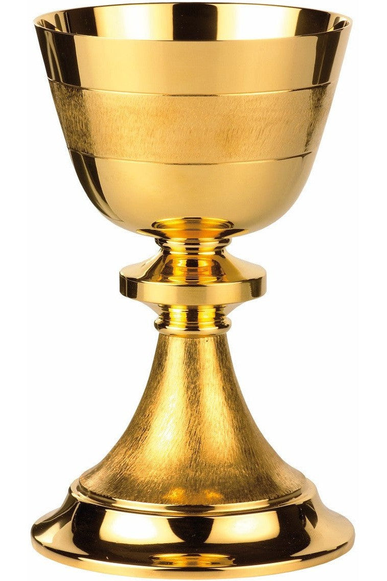 Unit price perBrass gold plated chalice and scale paten. 7 1/4" high with 4 1/8" cup. Holds 14 oz.