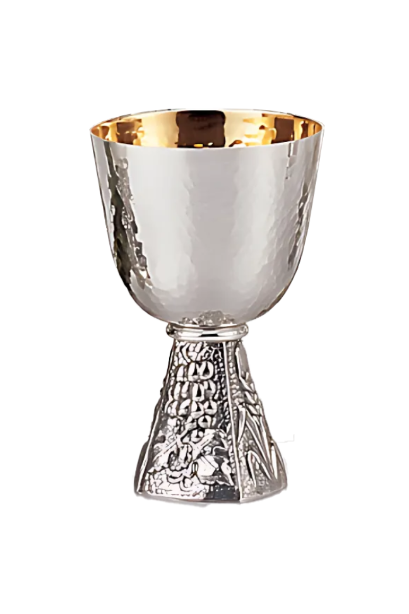 Unit price perThis striking Common Cup features a textured hand hammered cup and base with a raised grape and wheat motif on the base. The cup is brass silver plated with a gold lined inner cup.