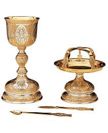 Matching large chalice, common cups, large bread plate, and flagon also available (see below).