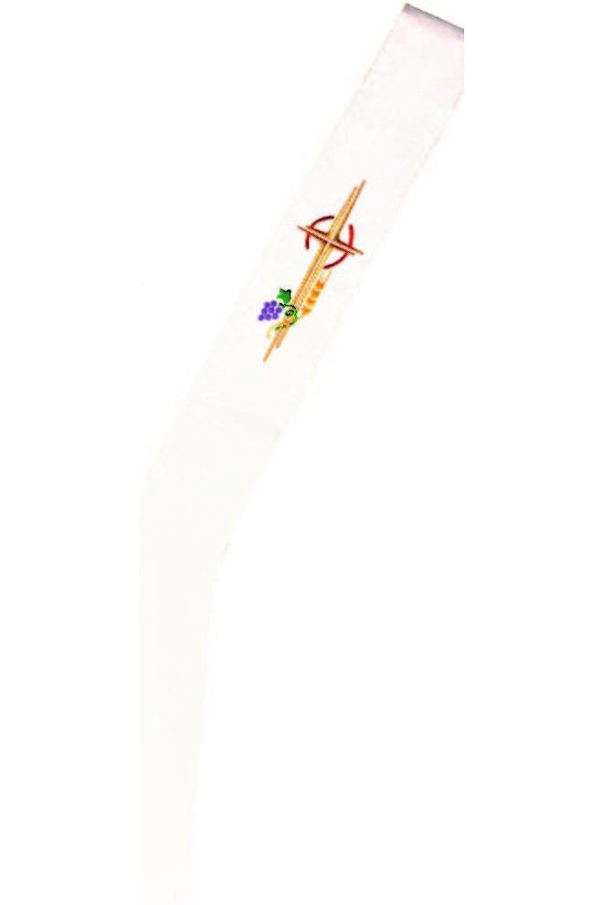 Unit price perDeacon stole In washable Dupion-fabric. Style 34: embroidery in front on chest height, at the back on lower panel. Worn from left shoulder to right hip. Exquisite embroidery in color threads. Only available in the designs as shown. All designs are available on each liturgical color.