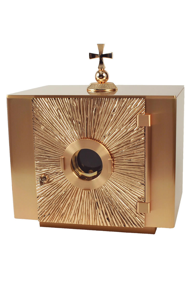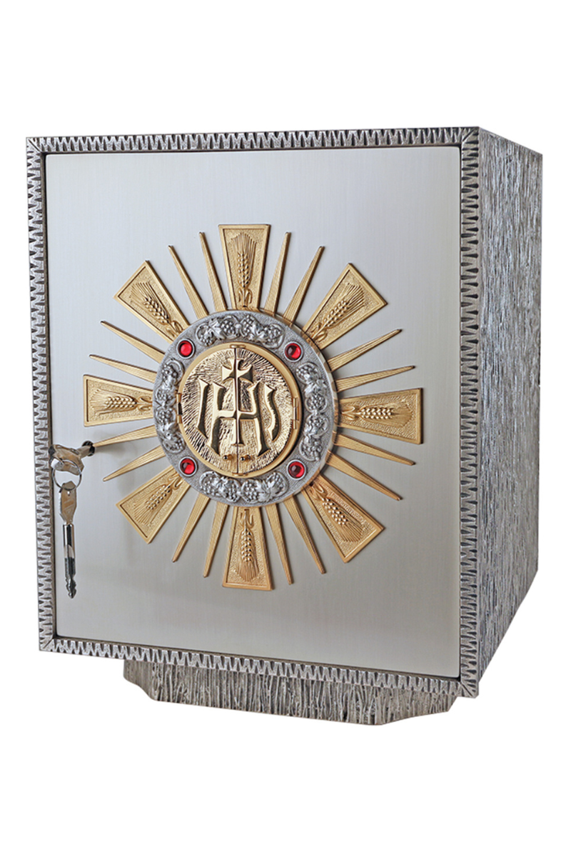 Unit price perTabernacle made of bronze with a Durable Oven Baked Finish. Bas relief sculpted decorations of satin and high polish bronze finish. Interiors lined with white silk and aromatic cedar. Door comes with a vault lock. If variant "With Dome" is selected the dome can be removed at any time to reveal a 11" diameter flat top surface perfect for displaying a monstrance.