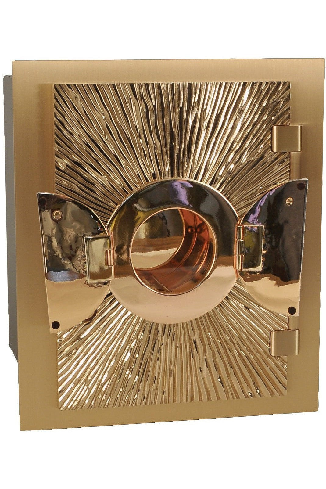 Unit price perTabernacles durable oven baked finish. Made of bronze with steel housing for insertion into wall cavity. Bas Relief Sculpted Decoration of High Polish Bronze finish. Interior lined with white silk and aromatic cedar.
