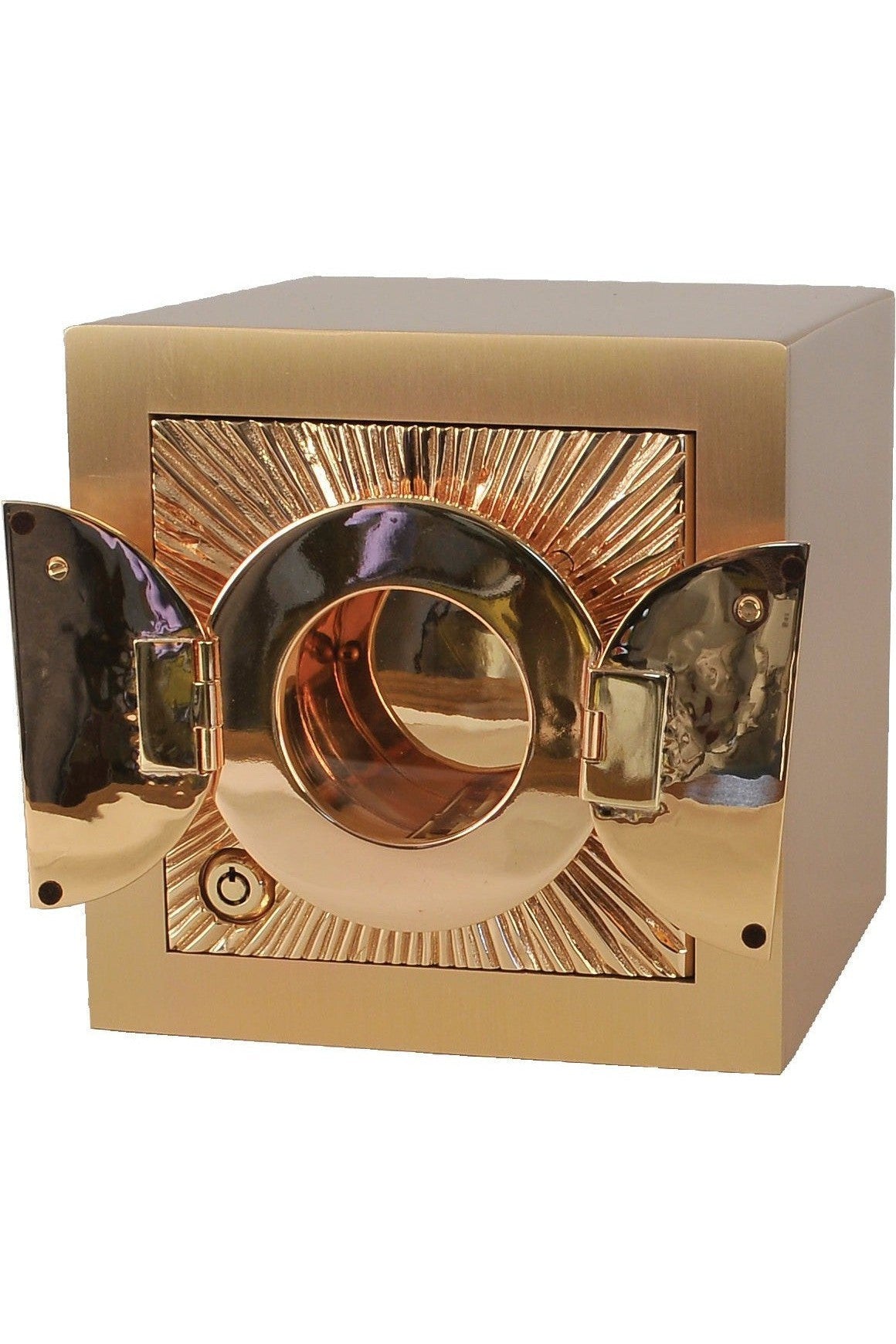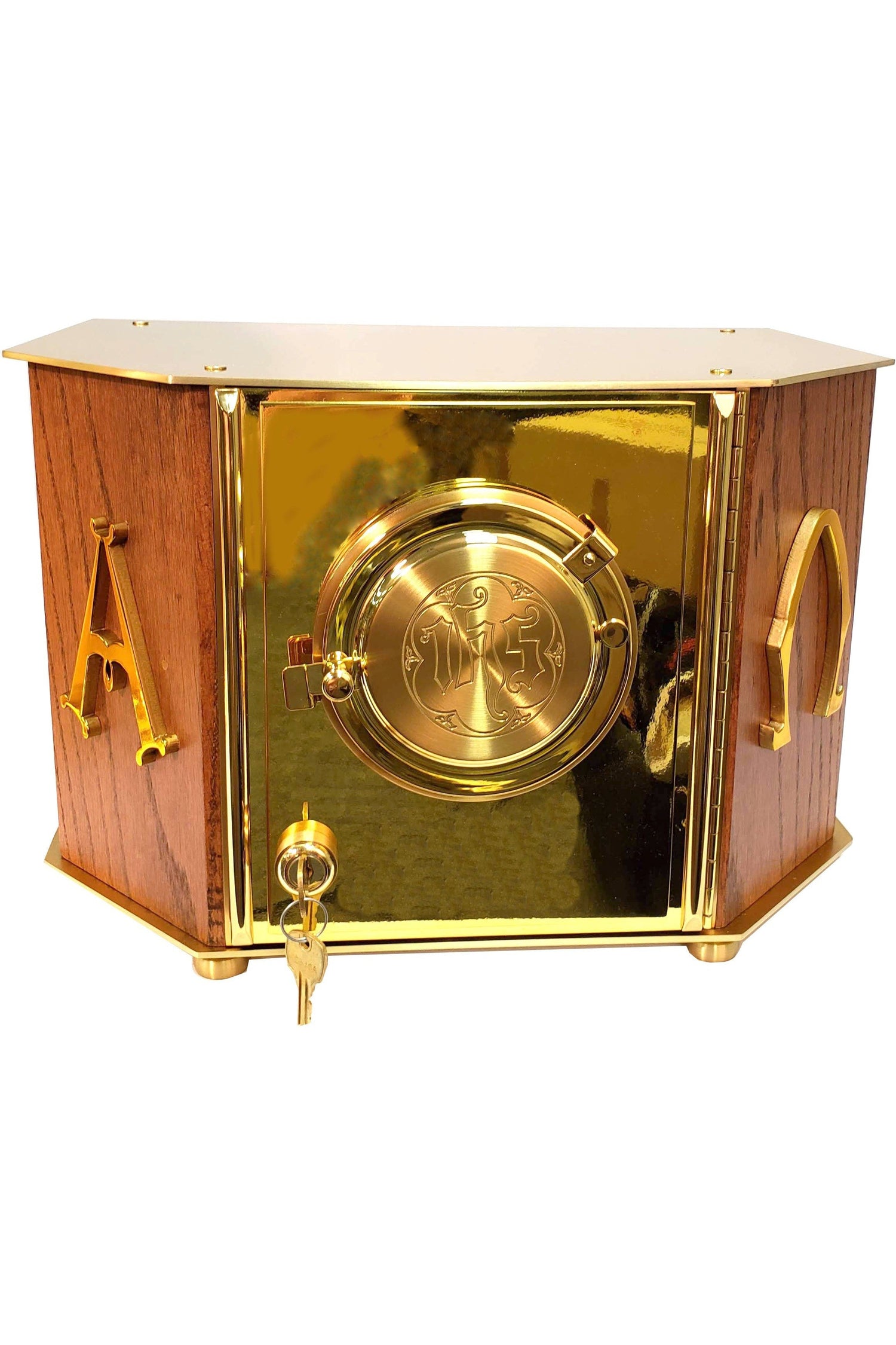 Unit price perThis Exposition Tabernacle brings an attractive and high quality made element to you altars repertoire. Made from a combination of Brass and Oak with polished Brass Alpha, Omega symbols. A satin inside lining has a linen texture contact material. The Exposition door has an engraving of IHS.