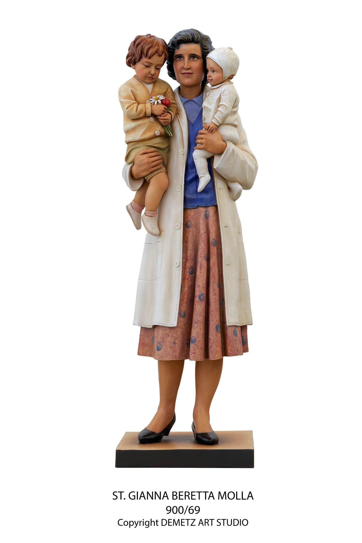 Unit price perSaint Gianna Beretta Molla with Children is made by the Demetz Art Studio in Italy. Hand carved out of fiberglass. It is hand painted in traditional colors. Available in one size. Each piece can be customized to your requirements.