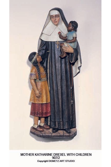 Unit price perSaint Katharine Drexel with Children - 3/4 relief - is made by the Demetz Art Studio in Italy. Hand carved out of fiberglass. It is hand painted in traditional colors. Available in one size. Each piece can be customized to your requirements.