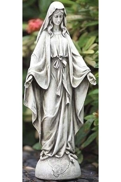Unit price perOur Lady of Grace Garden Figure. Made of resin/ stone mix. Dimensions: 14"H x 5.88"W x 3.75"D.