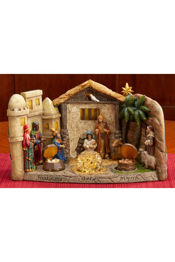 Unit price perJoseph holds a lighted lantern illuminating the infant Jesus in the manger as Mary prays reverently over her newborn son. Set in a rustic stable scene with soft back lights that gently illuminate this beautiful setting. The intricate detail and beautiful facial expressions bring the Holy Family to life and make a special Christmas display.