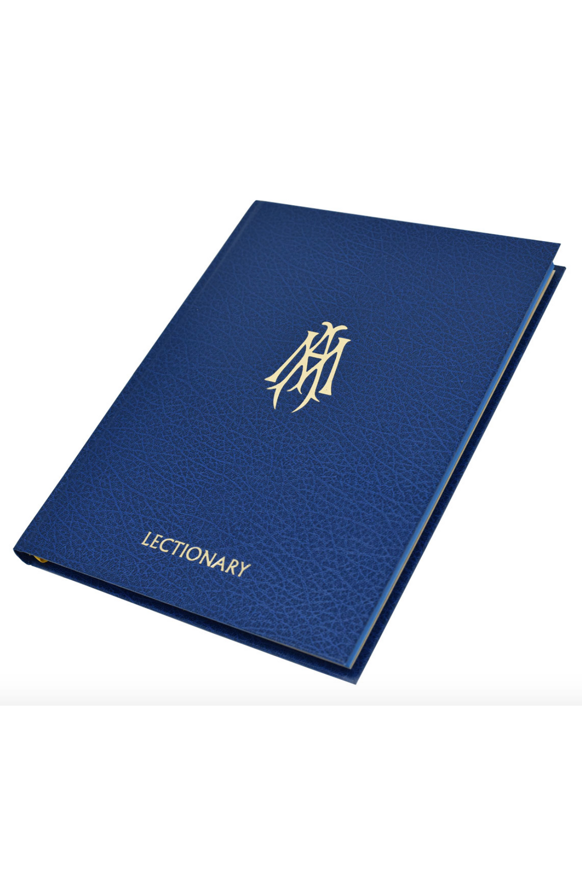 Unit price perThe Lectionary includes all the readings for these 46 Masses of the Blessed Virgin Mary. Size 8 1/2 X 11. Blue imitation leather cover. Special Features: 14 pt. Type. Printed in Two Colors. Liturgical Drawings Introduce Each Main Section. Includes Ribbon Markers. Durable, Attractive Binding.