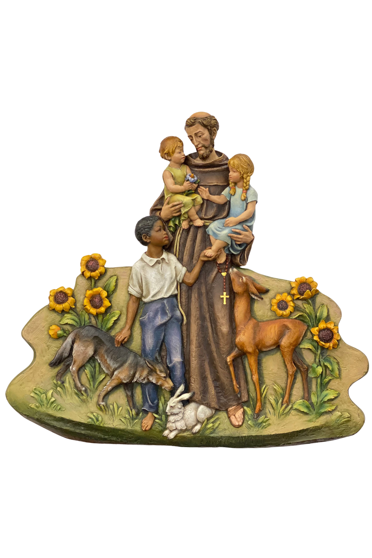 Unit price perA beautiful 40" x 48" fiberglass scene of St Francis of Assisi with children and animals. This is the perfect piece for any parish hall to showcase Saint Francis and the values of compassion and love of the Lord that he dedicated his life to.