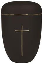 Unit price perGorgeus black steel urn with gold accent on lip of cover and gold cross.