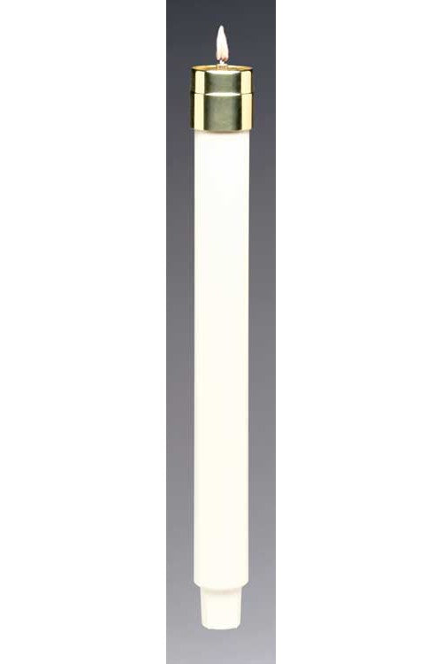 The candle light for the next century. Easy to use, no messy liquid refills. The liquid cartridge is encased in a candle-like plastic casing. Just remove the entire light and replace with a new one. For use in a candelabra or as a 1-1/8" altar candle.