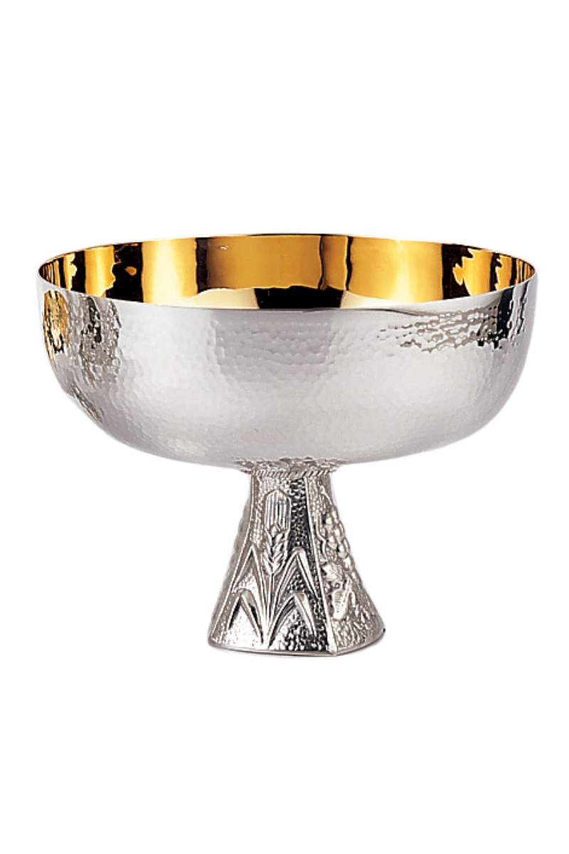 Unit price perThis striking open ciboria features a textured hand hammered cup and base with a raised grape and wheat motif on the base and ornamental rope node. The chalice is brass silver plated with a gold lined inner cup.