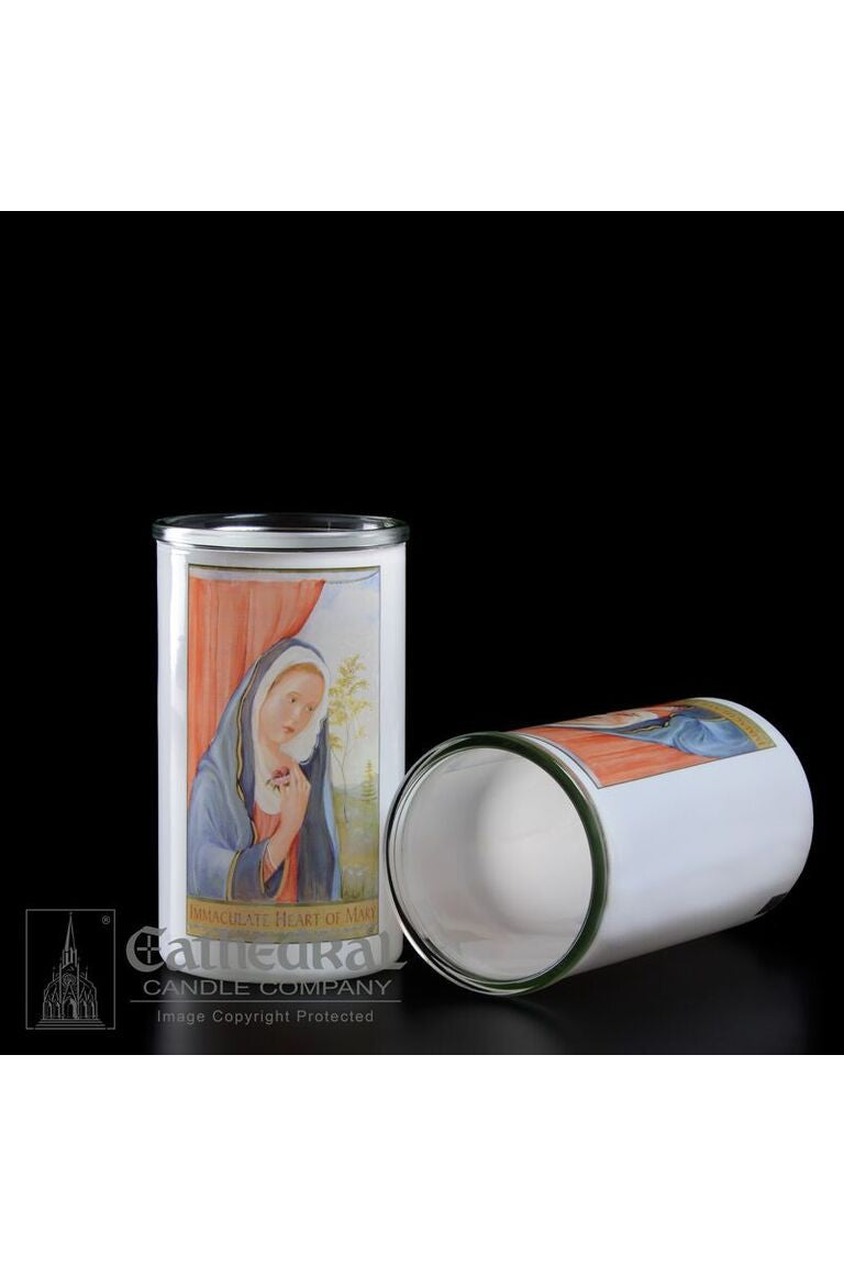 Unit price per5/6/7 day glass candle globes featuring Immaculate Heart of Mary. Available by the case of 12