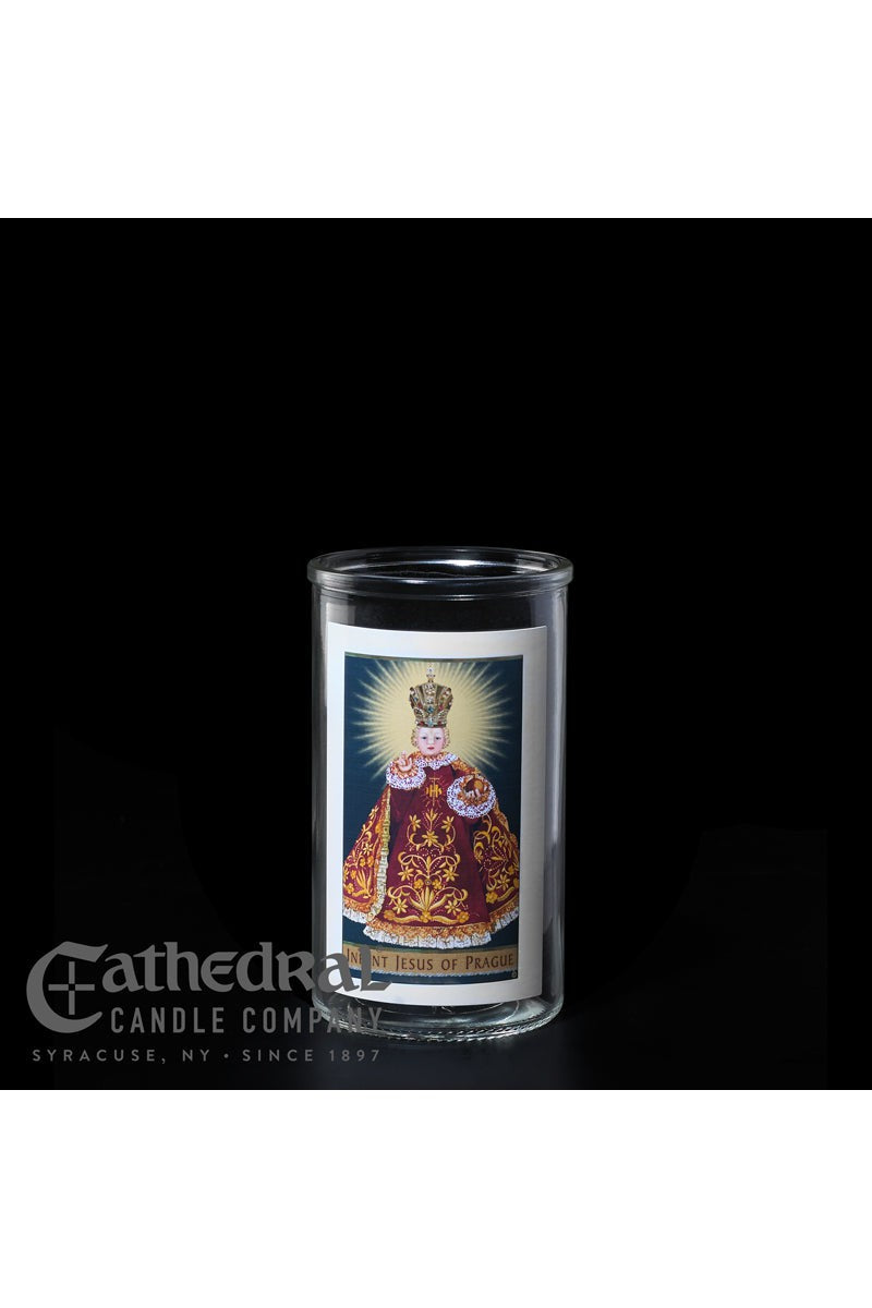 Unit price per3 day glass candle globes featuring Infant Jesus of Prague. Available by the case of 12