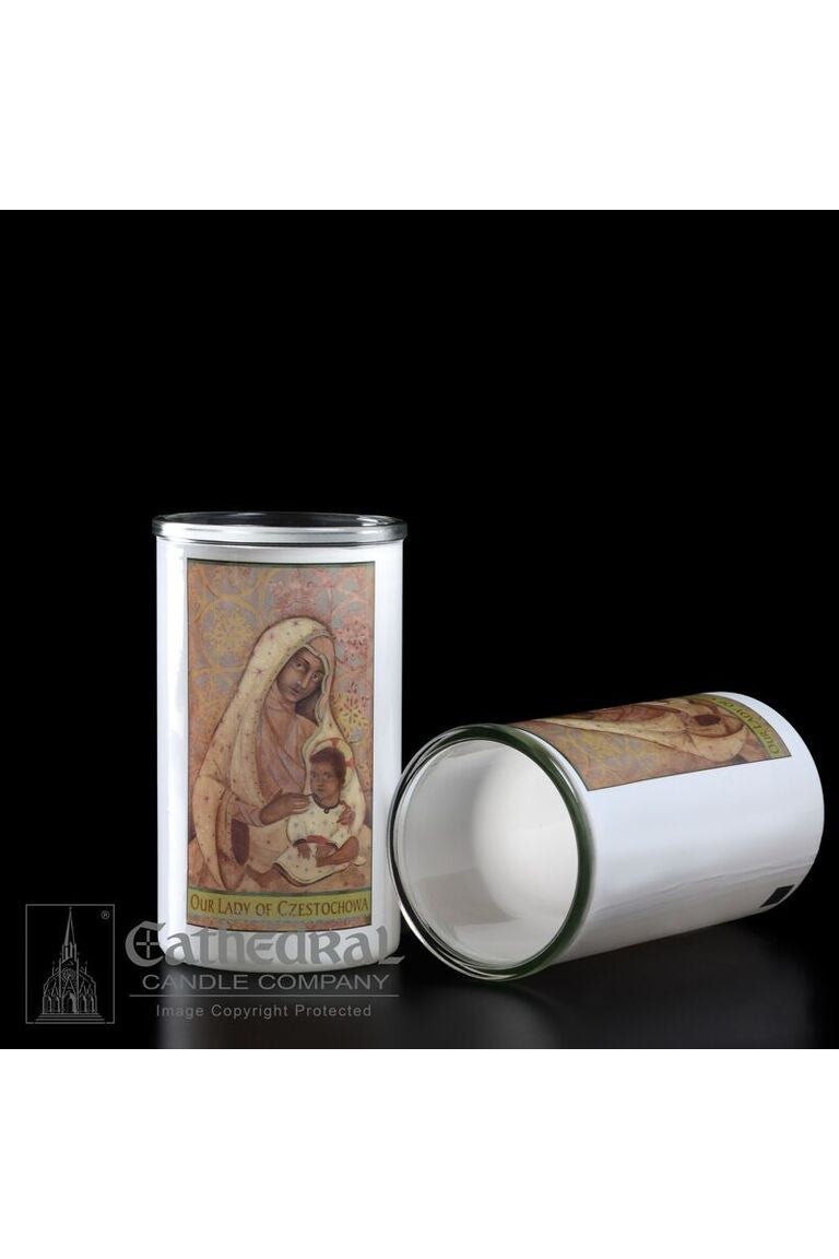 Unit price per3 day glass candle globes featuring Our Lady of Czestochowa. Available by the case of 12