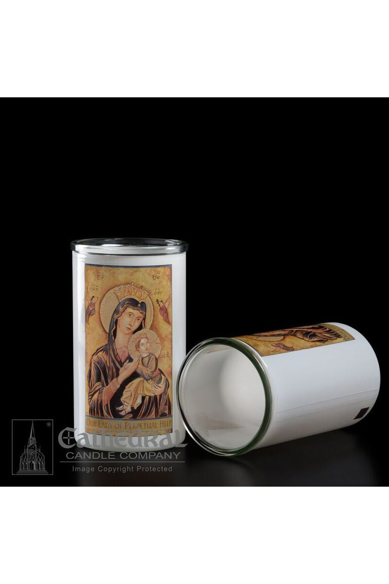 Unit price per3 day glass candle globes featuring Our Lady of Perpetual Help. Available by the case of 12