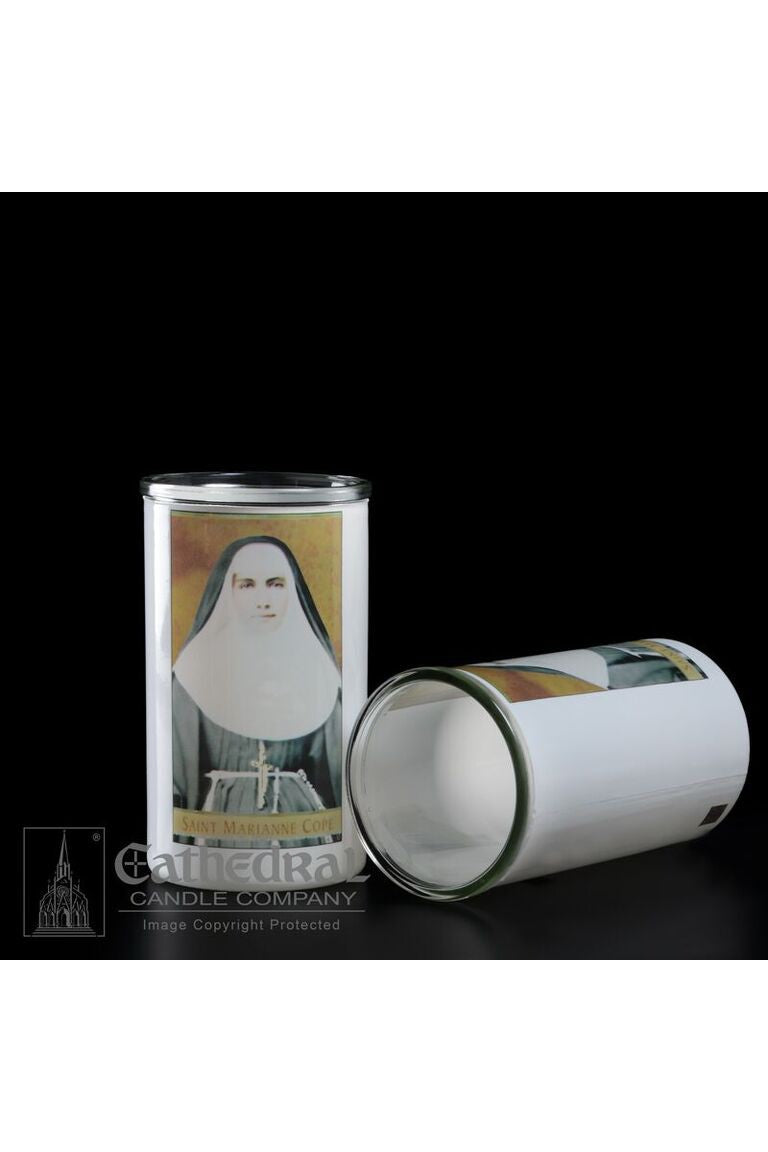 Unit price per3 day glass candle globes featuring Saint Marianne Cope. Available by the case of 12
