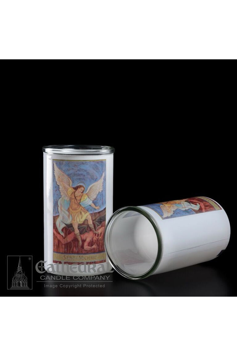 Unit price per3 day glass candle globes featuring Saint Michael. Available by the case of 12