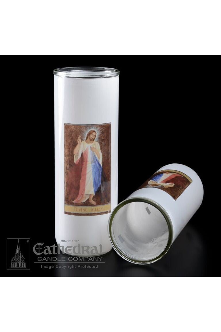 Unit price per5/6/7 day glass candle globes featuring Divine Mercy. Available by the case of 12