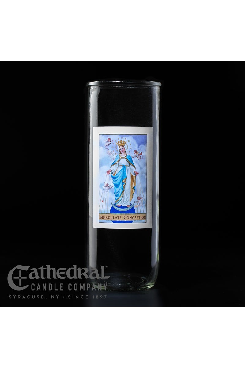 Unit price per5/6/7 day glass candle globes featuring Immaculate Conception. Available by the case of 12